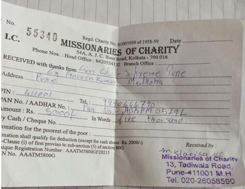 The donation of food and funds to the Mother Teresa Missionary represents the Lions Club of Pune Supreme’s commitment to community service and support for those in need. This activity not only provided immediate assistance but also strengthened the bond between the Lions Club and the mission.