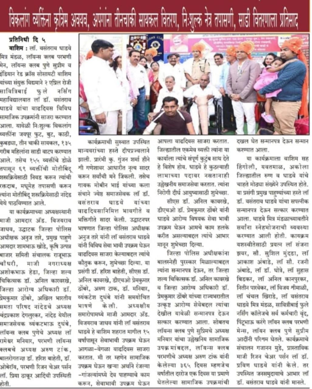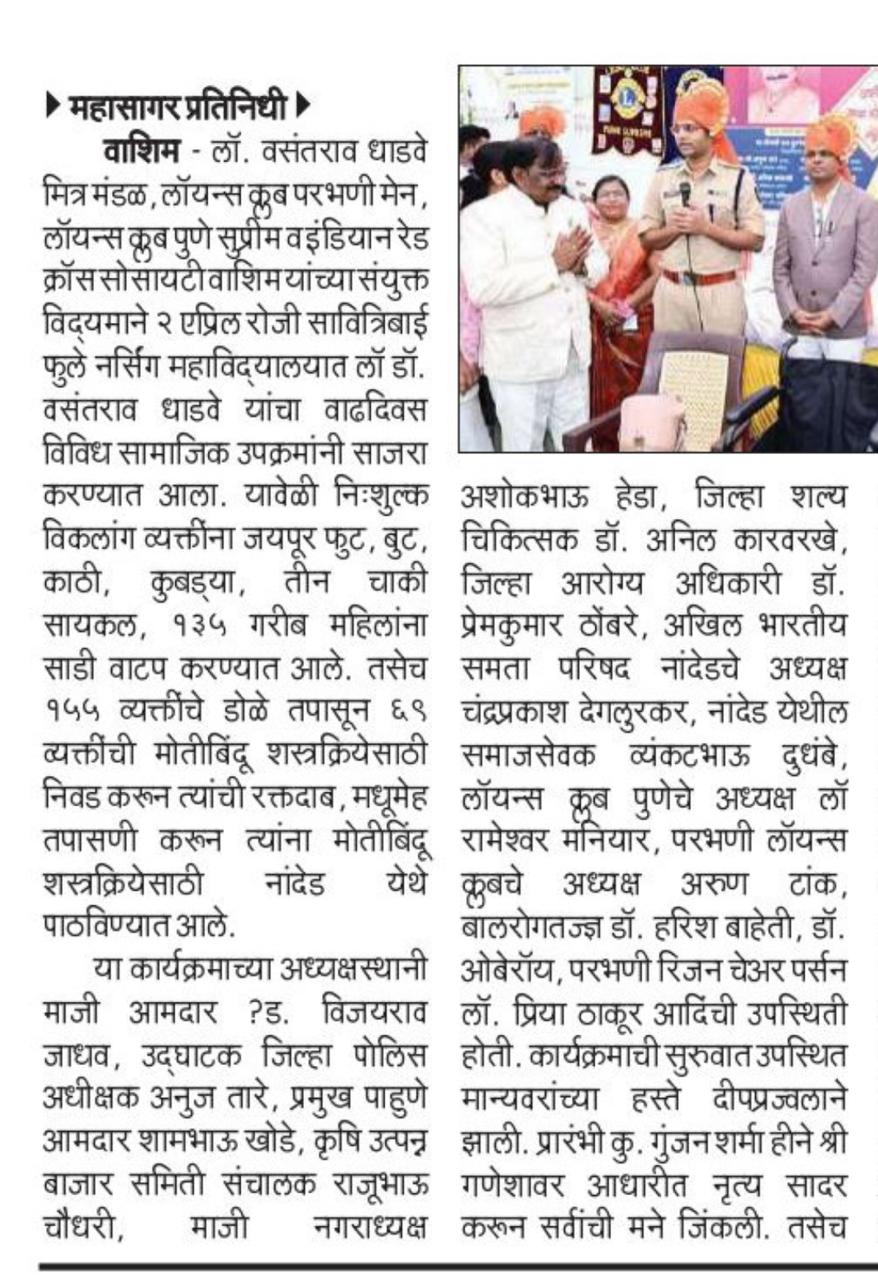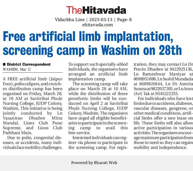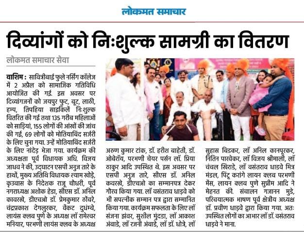 The Jaipur Foot was a significant and impactful event aimed at providing artificial limbs, polio calipers, and crutches to individuals with disabilities. This humanitarian initiative was organized by Lions Club of Pune Supreme, Lions Club Parbhani Men, and Ln. Vasantrao Dhadve Friends Club, and took place in Washim. The event was led by President Rameshwar Maniyar (Lions Club Pune Supreme), President Avi Tak (Lions Club Parbhani Men), and Lions member Ln. Sushil Mundada. The initiative sought to enhance the quality of life for people with mobility challenges, giving them the opportunity to regain independence and lead more empowered lives.