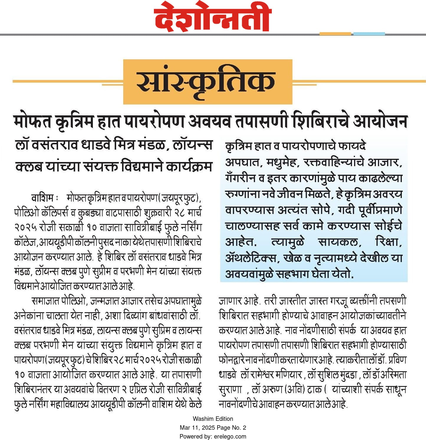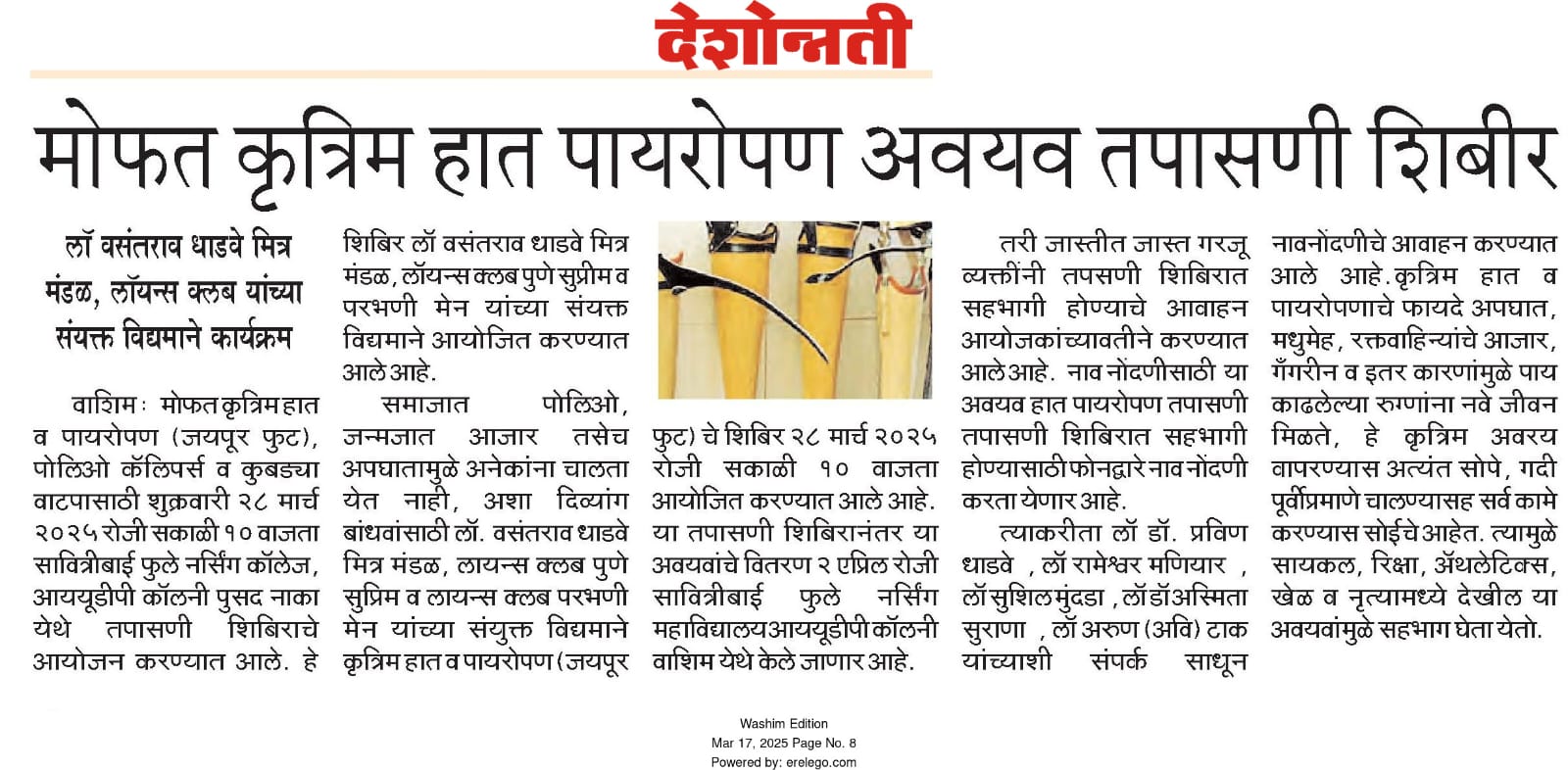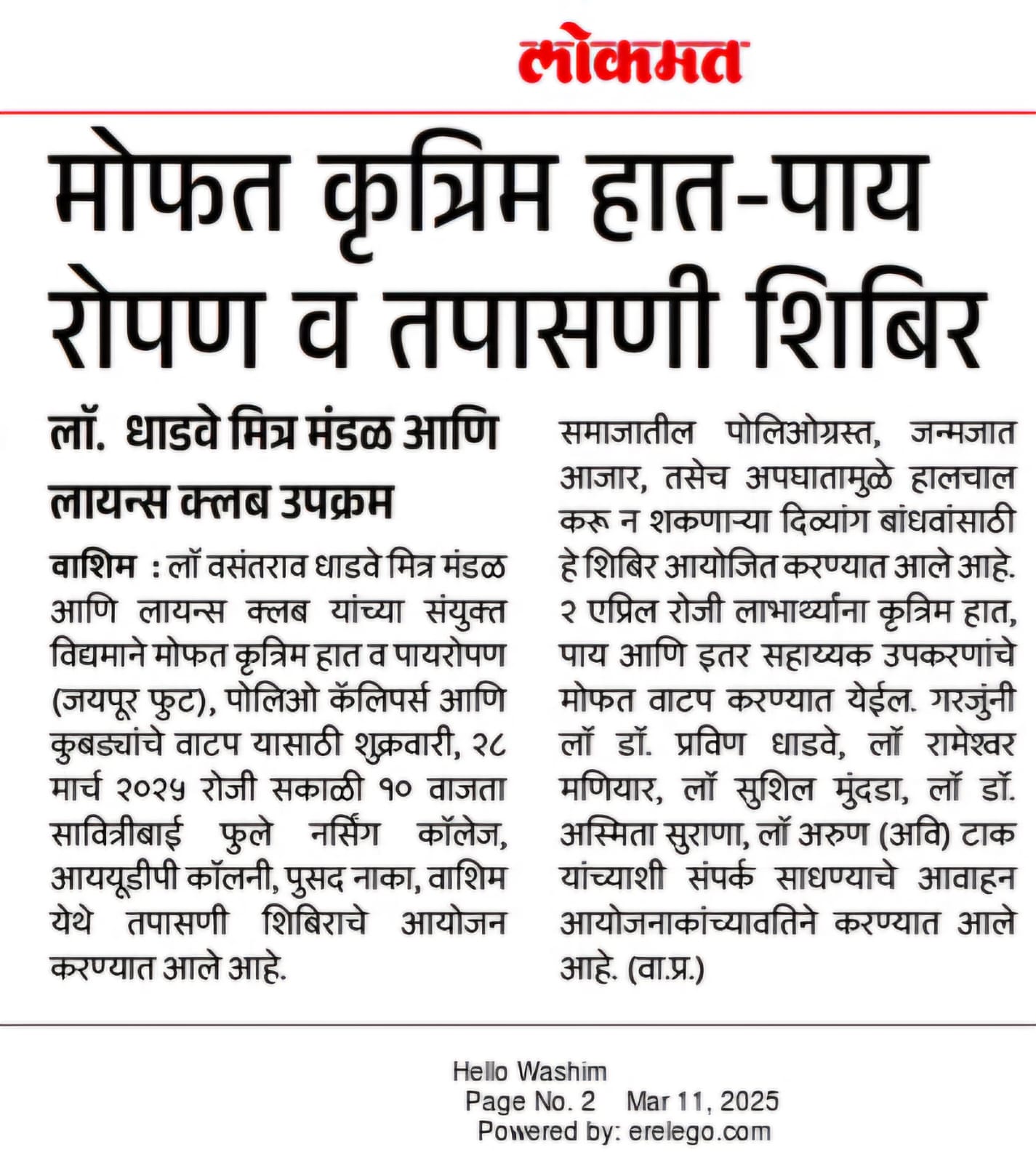 The Jaipur Foot was a significant and impactful event aimed at providing artificial limbs, polio calipers, and crutches to individuals with disabilities. This humanitarian initiative was organized by Lions Club of Pune Supreme, Lions Club Parbhani Men, and Ln. Vasantrao Dhadve Friends Club, and took place in Washim. The event was led by President Rameshwar Maniyar (Lions Club Pune Supreme), President Avi Tak (Lions Club Parbhani Men), and Lions member Ln. Sushil Mundada. The initiative sought to enhance the quality of life for people with mobility challenges, giving them the opportunity to regain independence and lead more empowered lives.