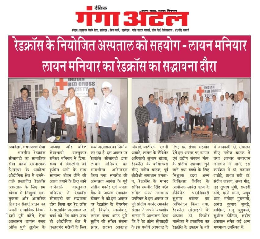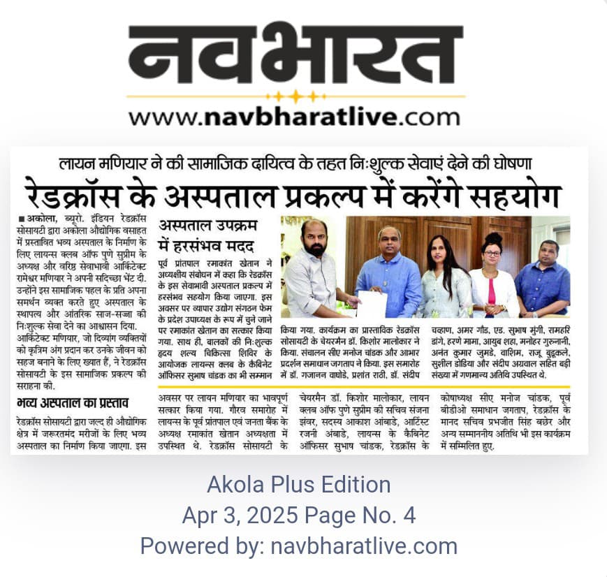 During the meeting, Ln. Rameshwar Maniyar, President of the Lions Club and a noted architect, presented the proposal and pledged support through free architectural and interior design services for the hospital project. His noble gesture was warmly appreciated by Collector Shri. Ajit Kumbhar, who is also the President of the Akola Red Cross Society.